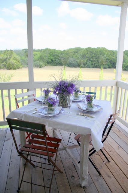 During a recent party, the back porch was a favorite place for guests to hang out, click here to see more. I made homemade bunting for the back porch for a festive feel. Can you see the bluebonnets in the distance?