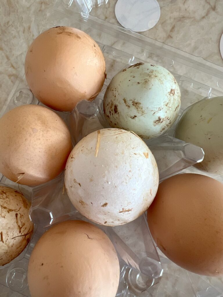 About two miles from our house is a rural community, and I’m lucky enough to buy our eggs each week from a local farm where the chickens roam freely and truly live their best life. (I haven’t cleaned the eggs here yet)