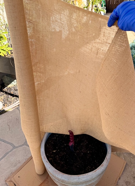 Cut your burlap accordingly and apply the burlap to the planter. I used a spray adhesive so it would stick. This will ensure