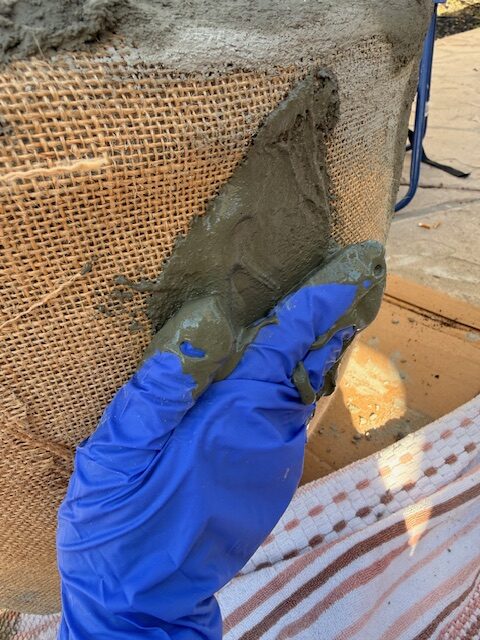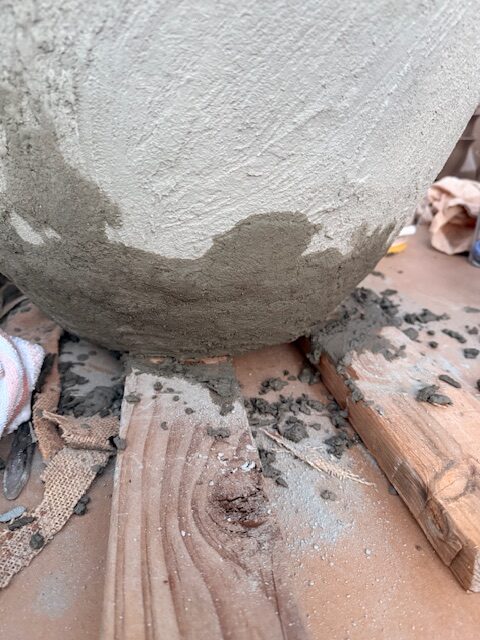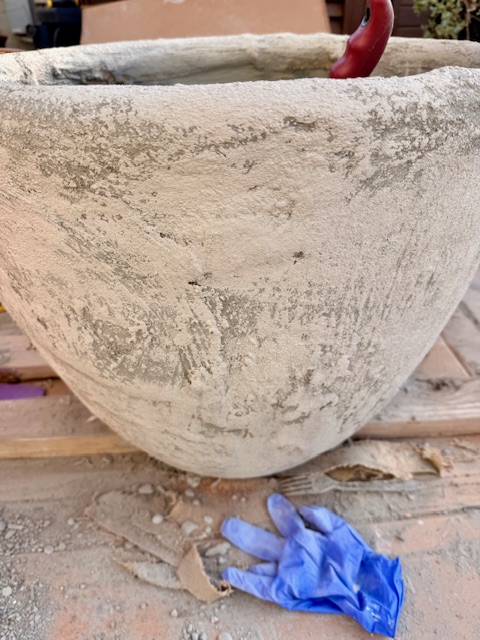 For your next step, using your hands (with gloves), apply the first coat in small sections, covering the entire pot. Don’t worry about perfection. The best part of creating aged pots is that imperfections make them look more authentic. Press some of the mixture around the rim of the pots to give them that weathered, real stone character.