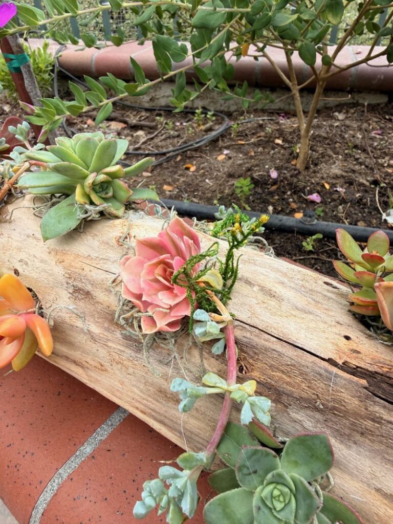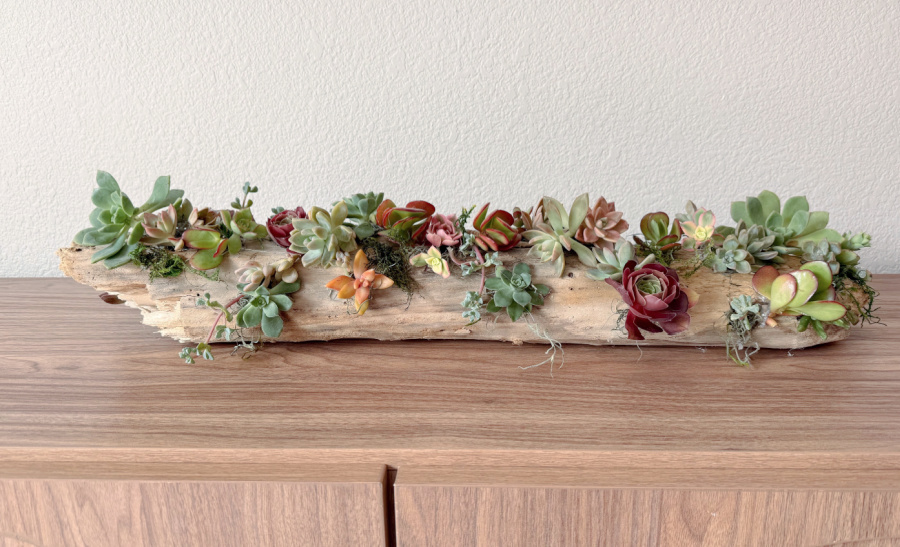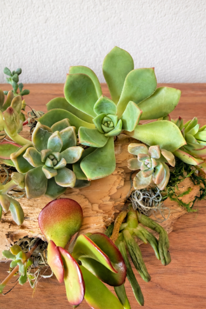 Succulents don’t need much water, especially when planted in wood. Mist lightly every week or two, depending on your climate. Make sure the moss dries between waterings to prevent rot. Over time, the succulents will root into the moss and become even more secure.