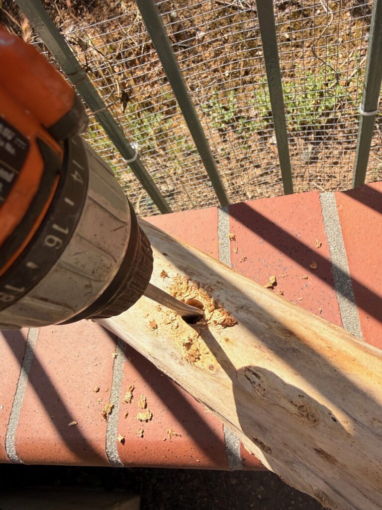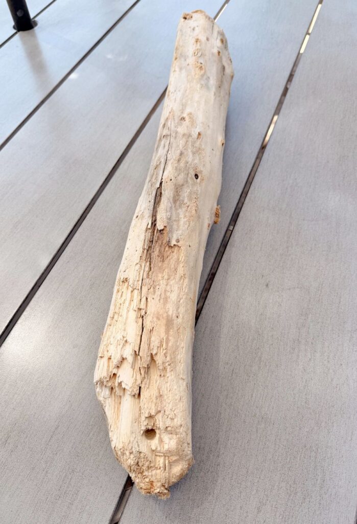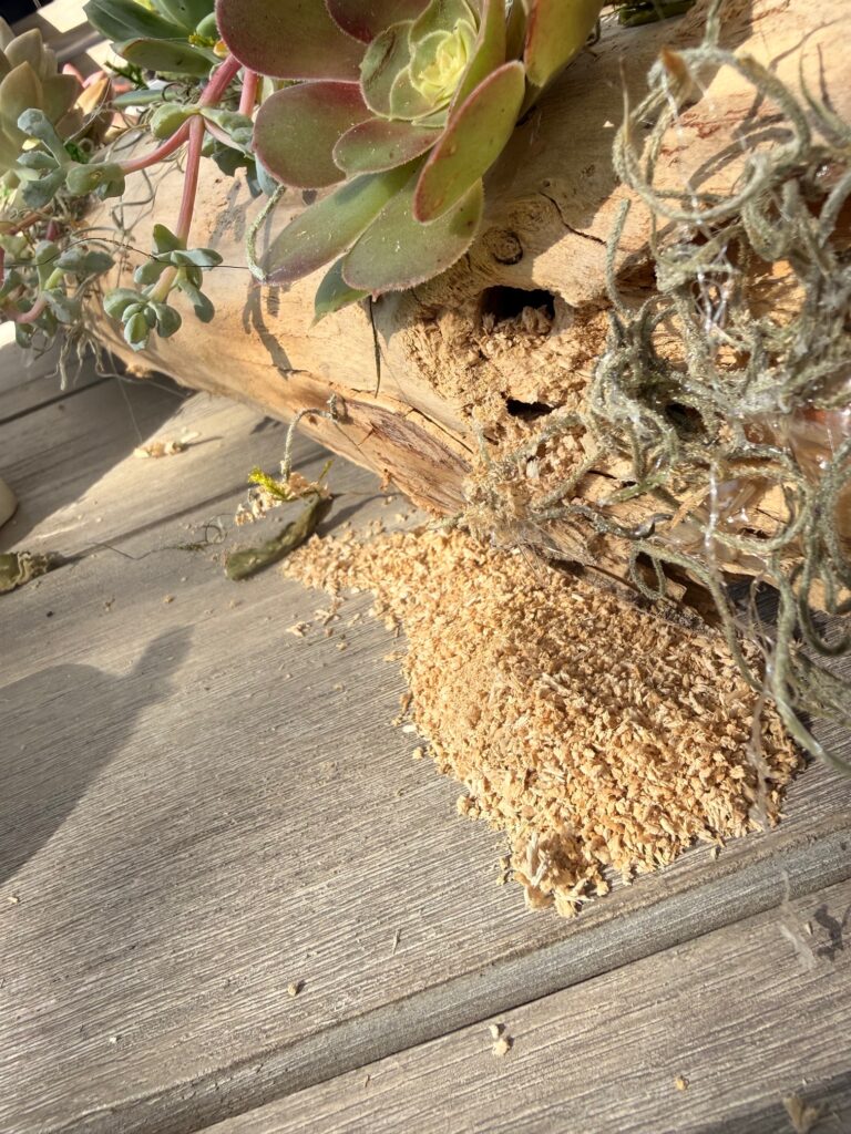 When we got home, I set the driftwood out in the backyard and didn’t think much of it—until the next morning. I walked outside to find a carpenter bee hovering nearby and a surprisingly large pile of sawdust beneath the wood. It felt odd, but I brushed it off and cleaned it up.
