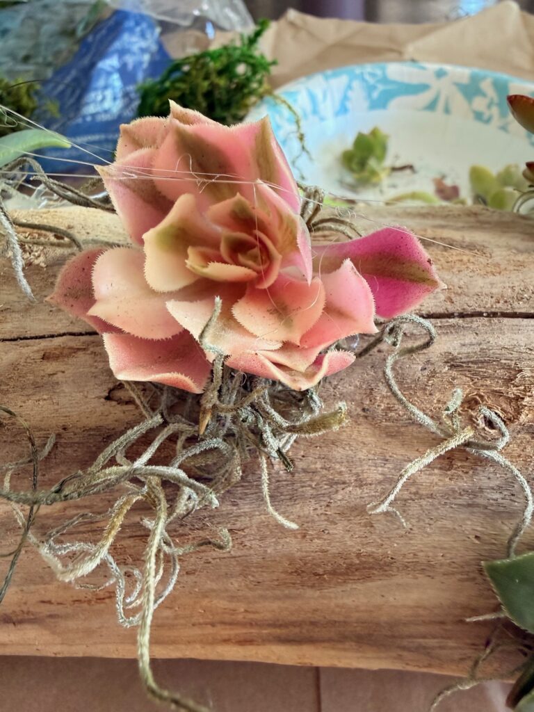 Gently press each succulent cutting into the moss. They don’t need much water, so avoid soaking the arrangement. I was about half way done here.