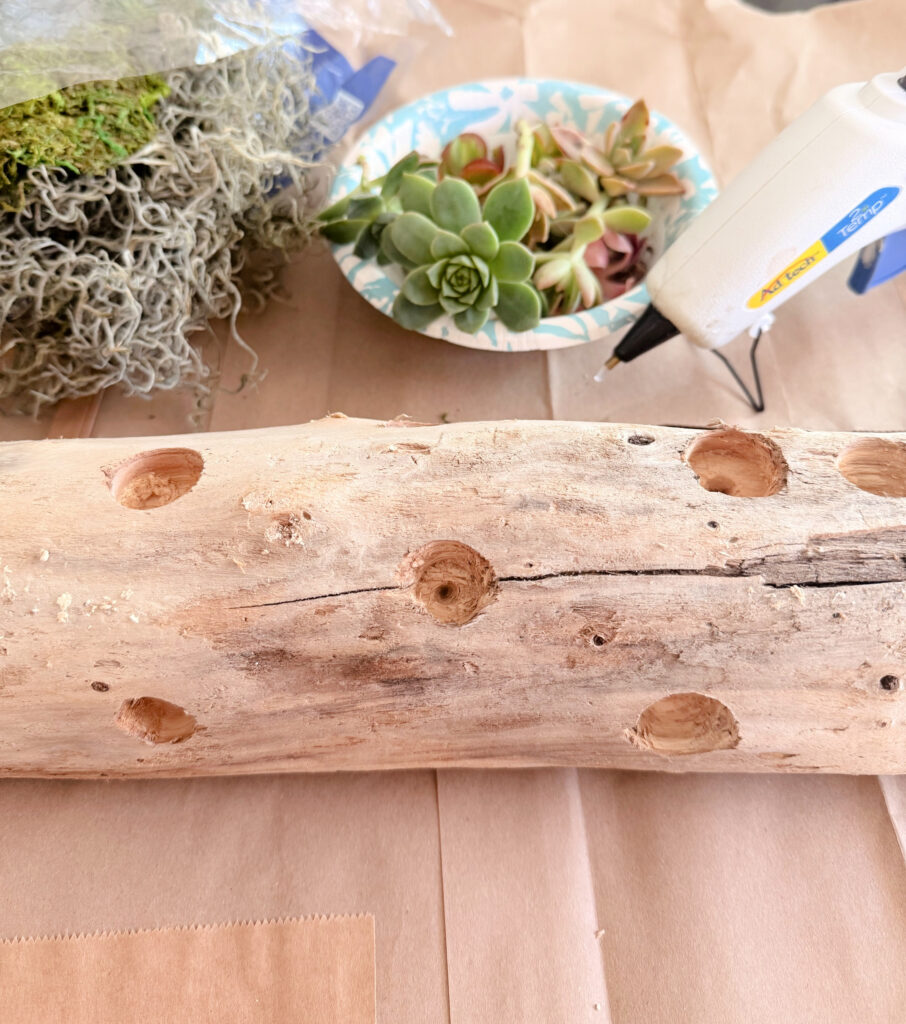 Start by looking for driftwood pieces with natural holes or crevices. These little pockets are perfect for holding moss and succulents without extra cost or complicated tools. If your wood doesn’t have enough space, use a drill bit to create small openings. I used a drill bit. You only need shallow holes, just deep enough to tuck in moss and prevent excess water from pooling.