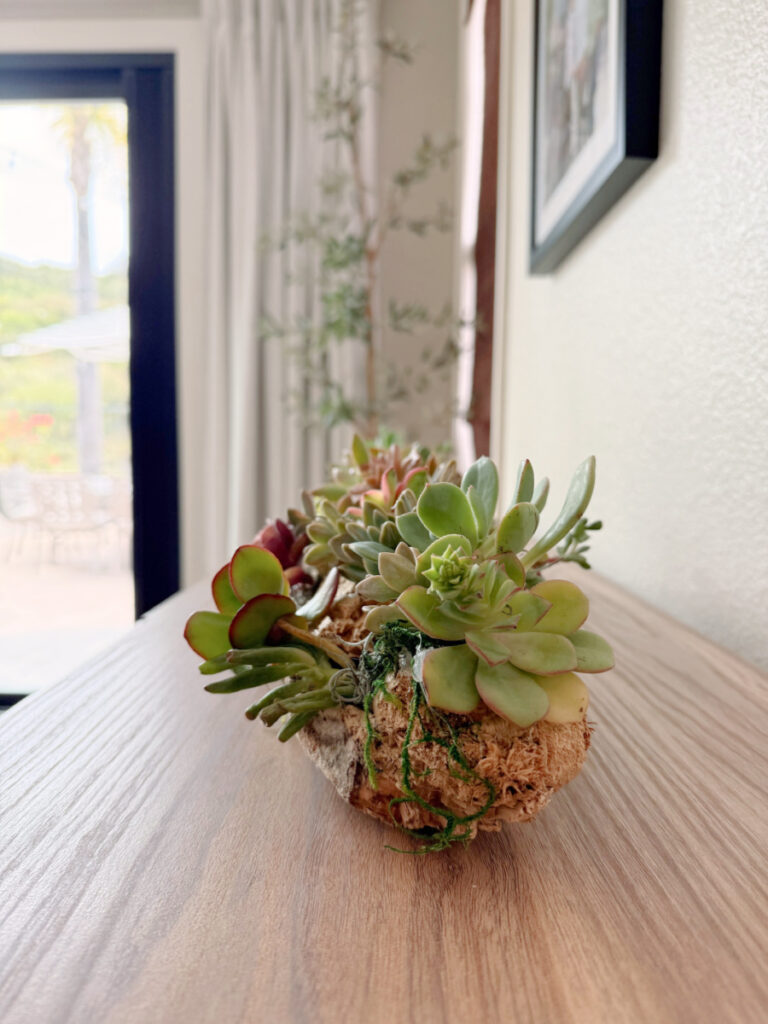 A light mist is enough to help them settle in. If you’re using faux succulents, simply glue them into place for a maintenance‑free look.