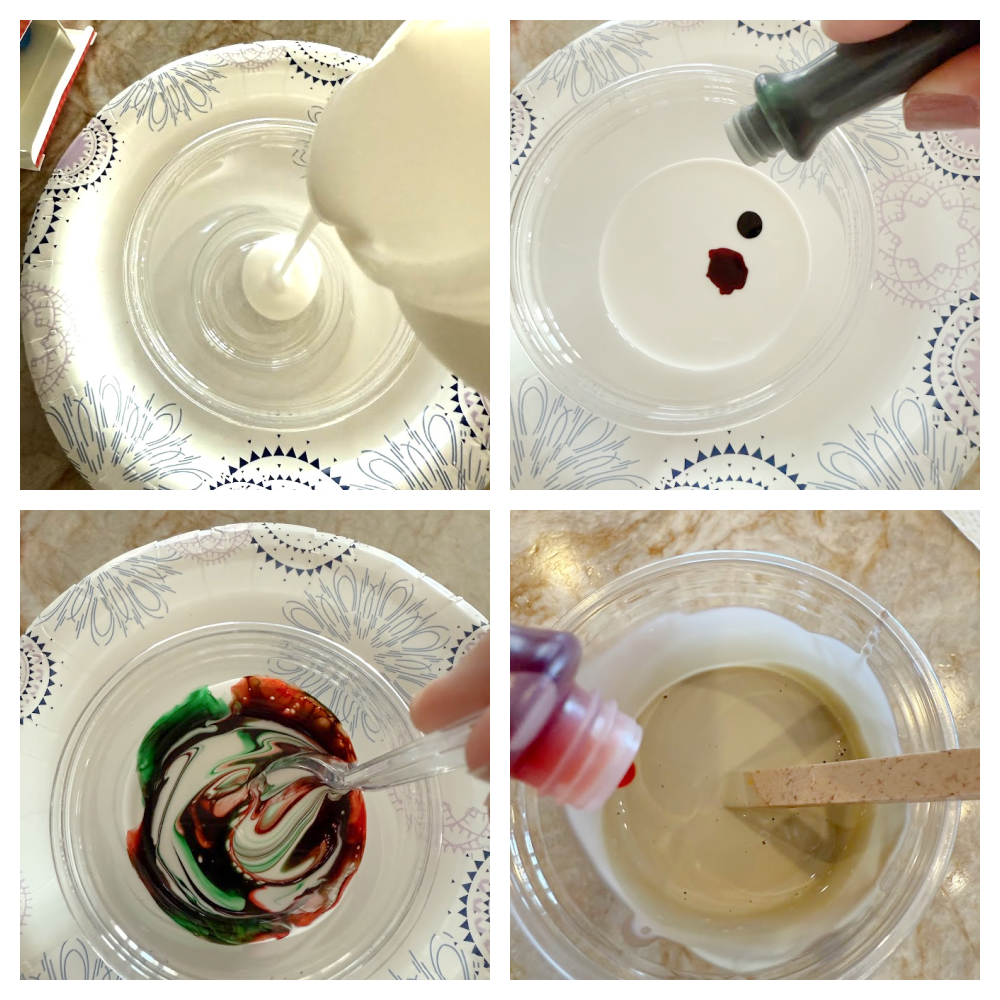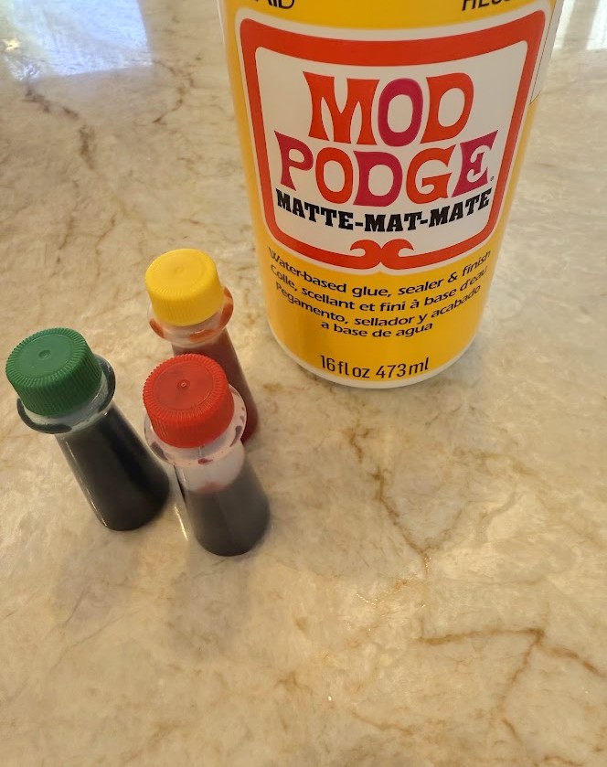 For a total of 3 glass pieces, I used 1/2 a cup of Mod Podge and 4 drops of red and 4 drops of green food coloring. It is a 1:1 ratio. Stir the mixture until you achieve a color that looks tan or light brown. It will not be a full amber, dark brown color at this stage, which happens during the “cooking process.” For my last 2 pieces, I added 2 drops of yellow to the mix, and it gave them a darker color. You can simply play around with the colors until you come up with something you love.