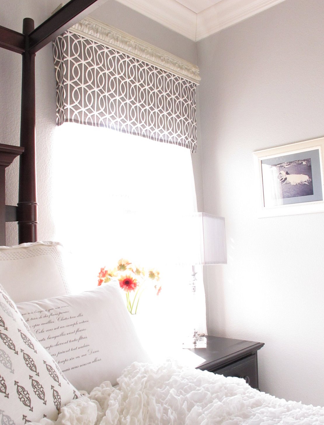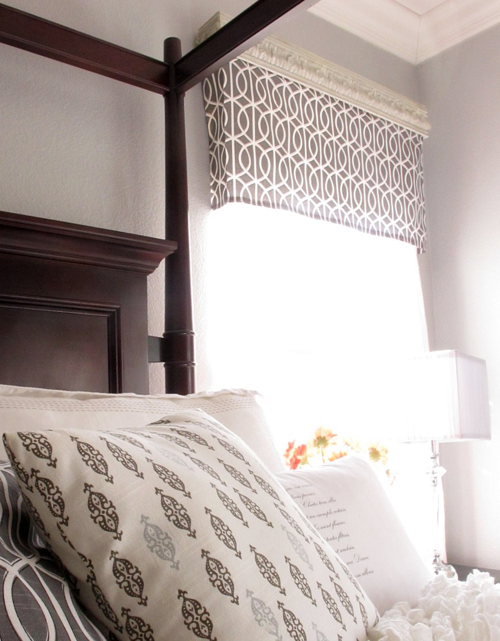 I wanted a little modern twist to the bedroom this time around and fell in love with this fabric by Dwell Studio so I decided to make some new window valences.
