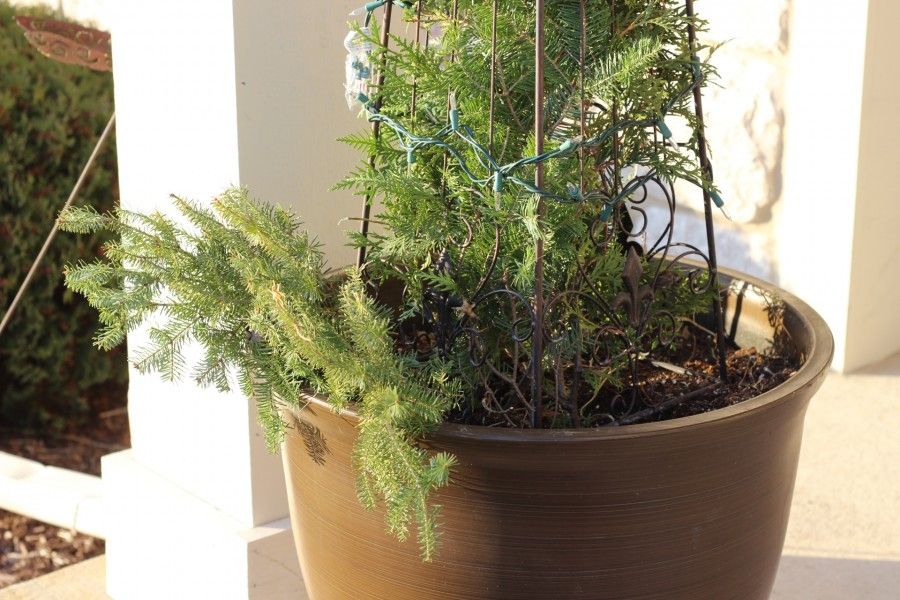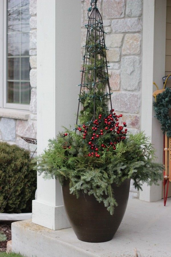 I put my topiary into my planter, wrapped lights around it, and stuffed branches in it.