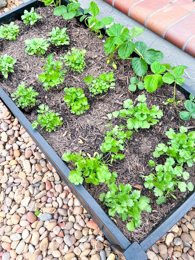 A few long, narrow containers can hold a lot of salad greens. As can a pot from the dollar store! This setup is perfect for anyone who wants to grow their own herbs. I love clipping the parsley or cilantro off whenever I need to.